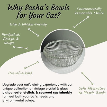 Upgrade your cat’s dining experience with our carefully curated, one-of-a-kind vintage crystal and glass dishes. Sourced with care and tested twice for lead safety, these dishes are more than just beautiful – they’re designed to meet your cat’s health and comfort needs, too!