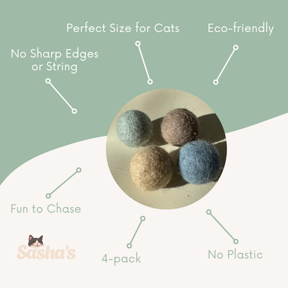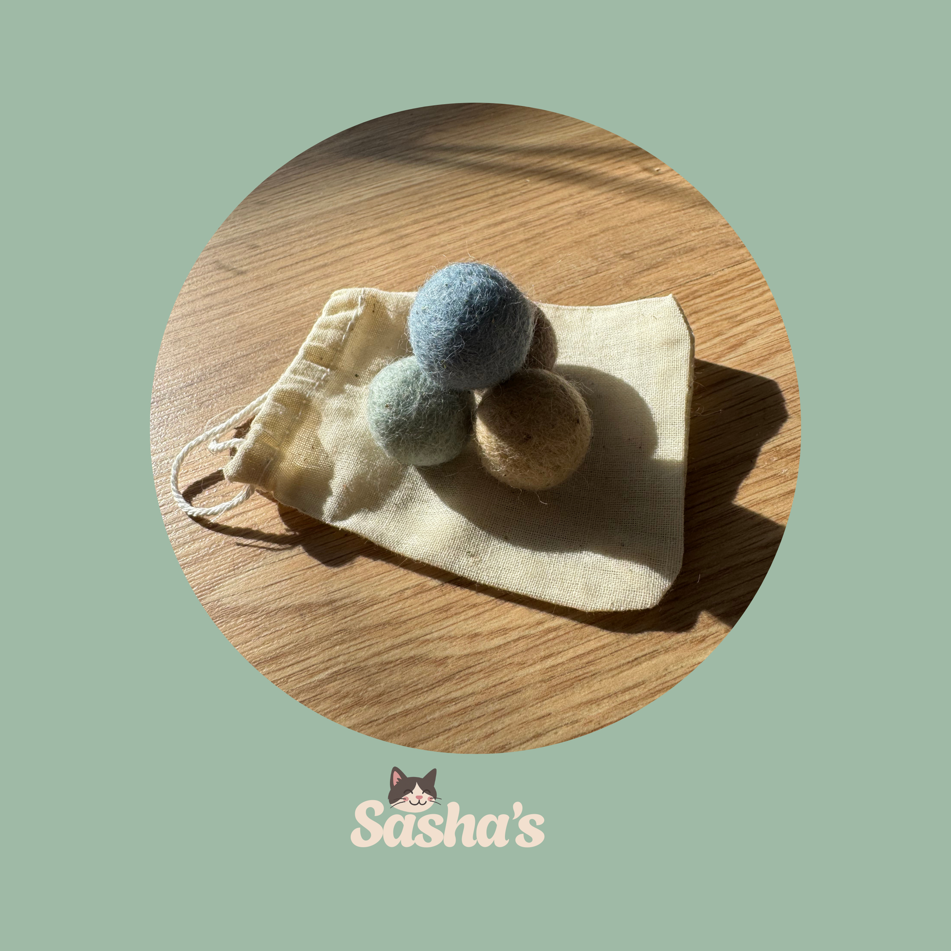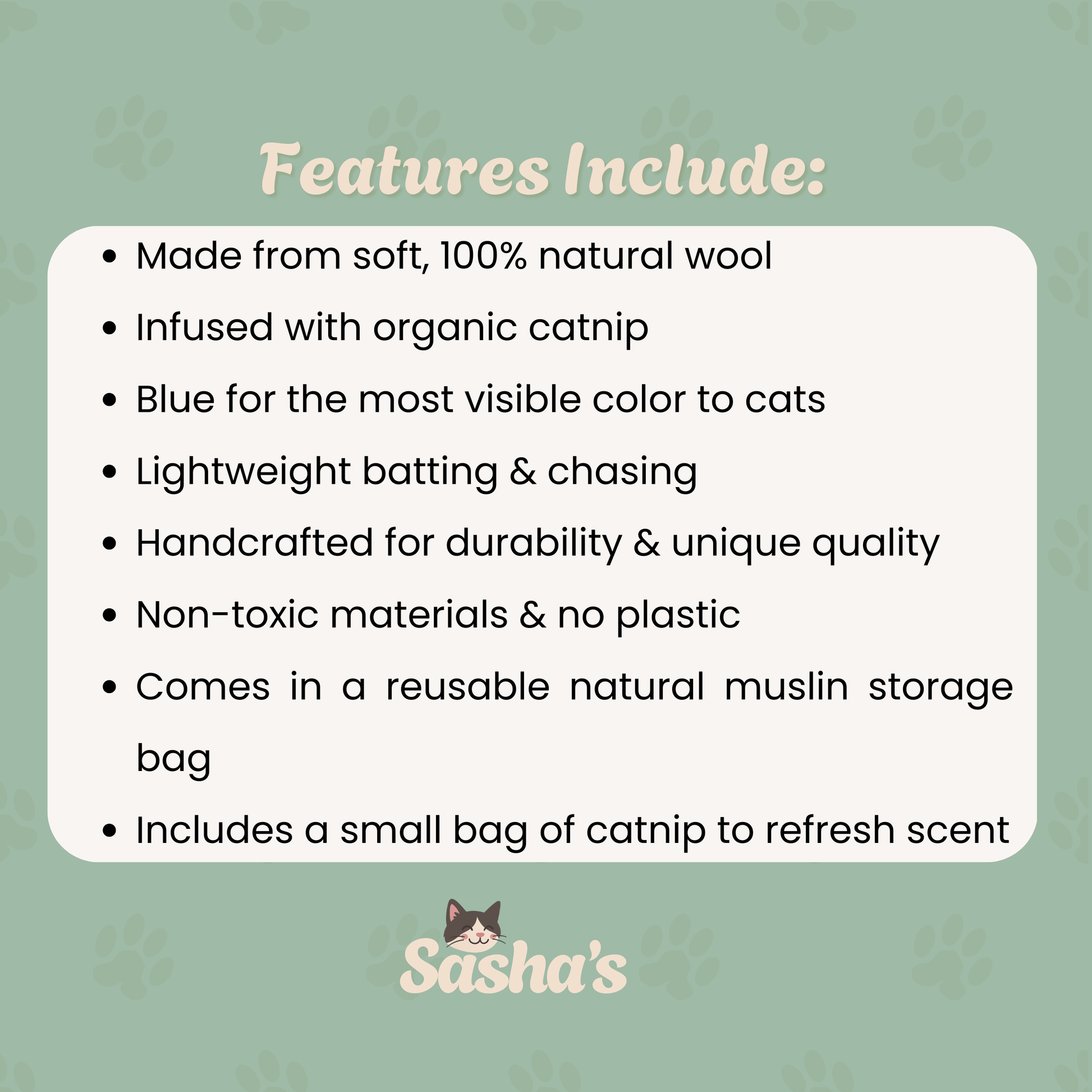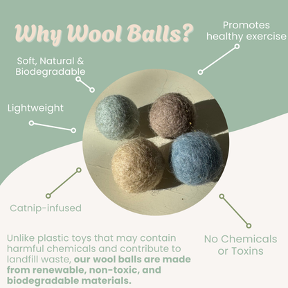 Treat your cat fun with our handcrafted Wool Cat Balls! This 4-pack features 2 neutral-colored balls and 2 vibrant blue balls, specially chosen as blue is the most visible color for cats. These lightweight, soft, and durable balls are perfect for interactive games, independent play, or simply batting around the house. Plus, they are covered in catnip & they come with a packet of catnip to recharge!