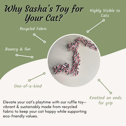 Bring endless joy to your cat with our Ruffle Toy, a bouncy, engaging toy designed to spark your cat’s natural instincts for play and exploration. Made with care and attention to what cats like, this ruffle strip toy combines vibrant colors, a fun texture, and an irresistible springy movement. As a bonus - it is crafted from recycled fabric that would otherwise go to waste!