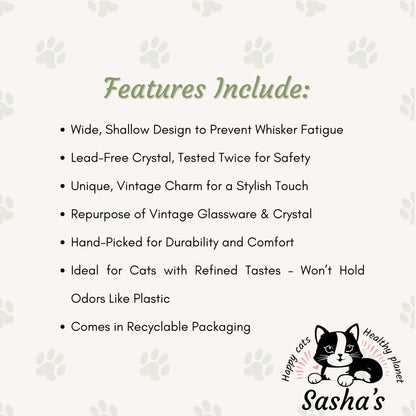 Why settle for ordinary when your beloved cat deserves extraordinary? Elevate your pet's dining experience with our handpicked vintage crystal and glass dishes, designed to combine timeless elegance with cat-friendly functionality.