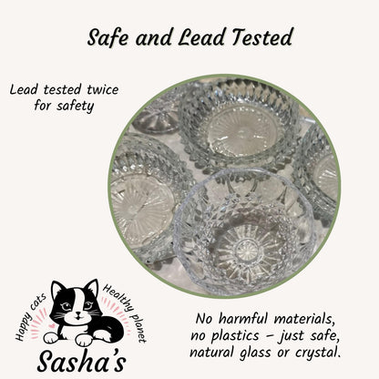 Give your cat a dining experience that’s as special as they are! Each repurposed vintage glass dish at Sasha’s is carefully chosen for its unique charm—whether it’s a floral motif or a classic pressed pattern. The shallow, wide shape is perfect for wet food, helping reduce whisker fatigue and keeping mealtime stress-free. Plus, the gentle elevation supports healthier posture, making every bite a little more comfortable for your furry friend.